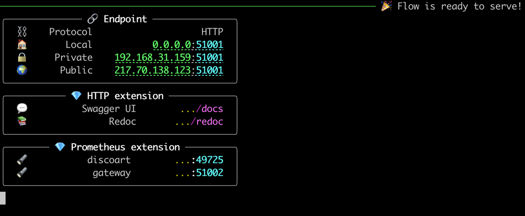 python -m discoart serve可以将 DiscoArt 部署为 gRPC/HTTP/WebSocket 服务。