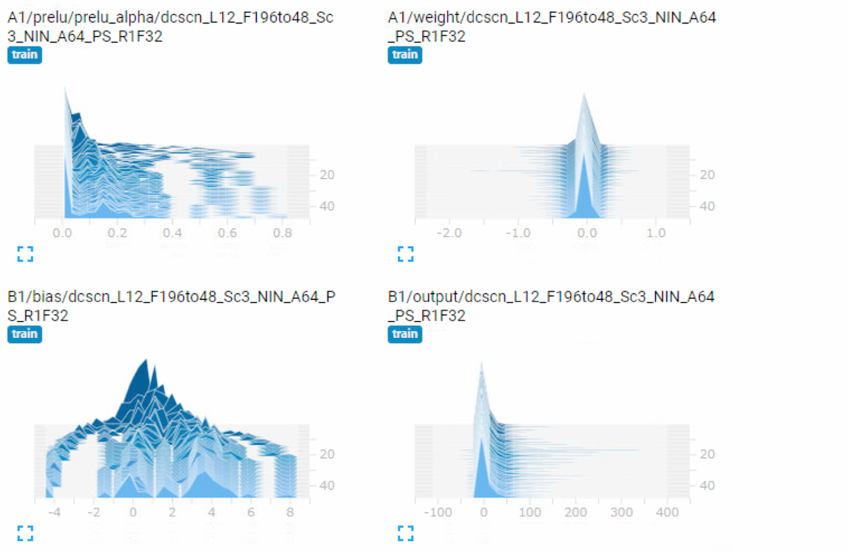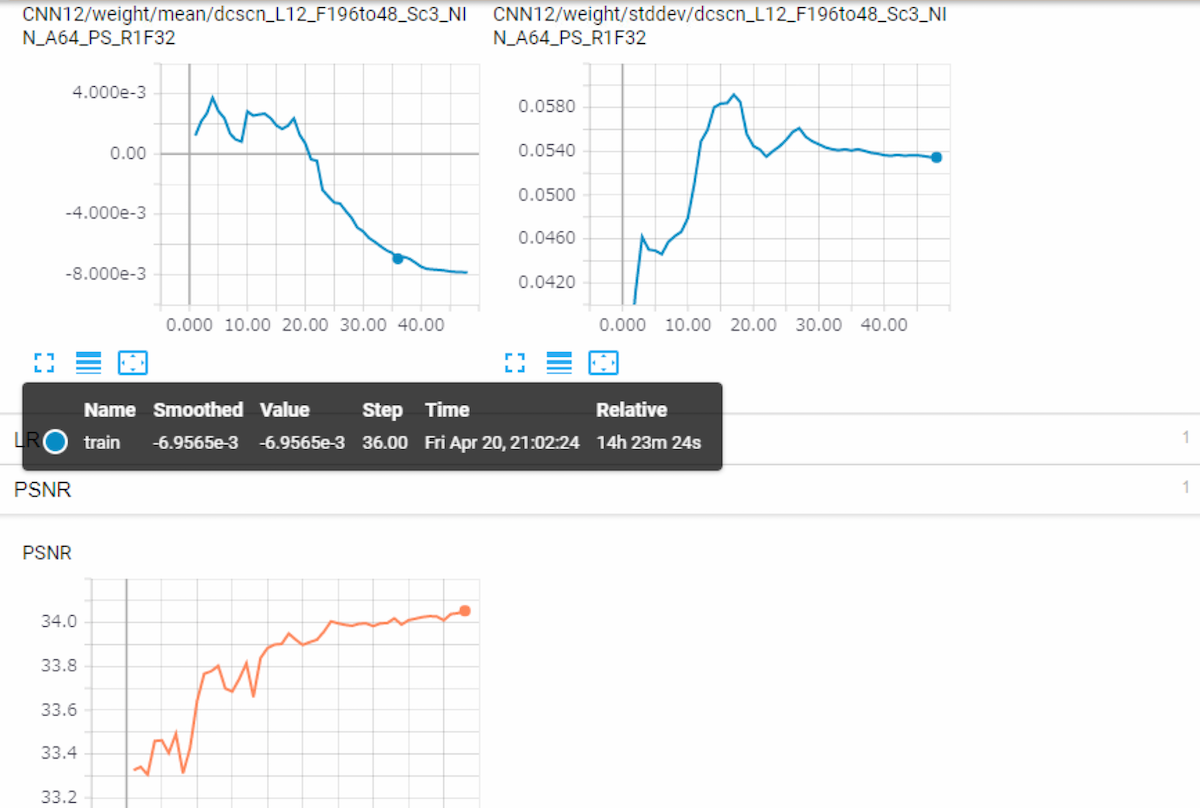 您可以在 TensorBoard 中查看训练过程中测试 PSNR 的变化趋势。此外,所有权重、偏置以及梯度的均值、标准差和直方图也会被记录到 TensorBoard 中。