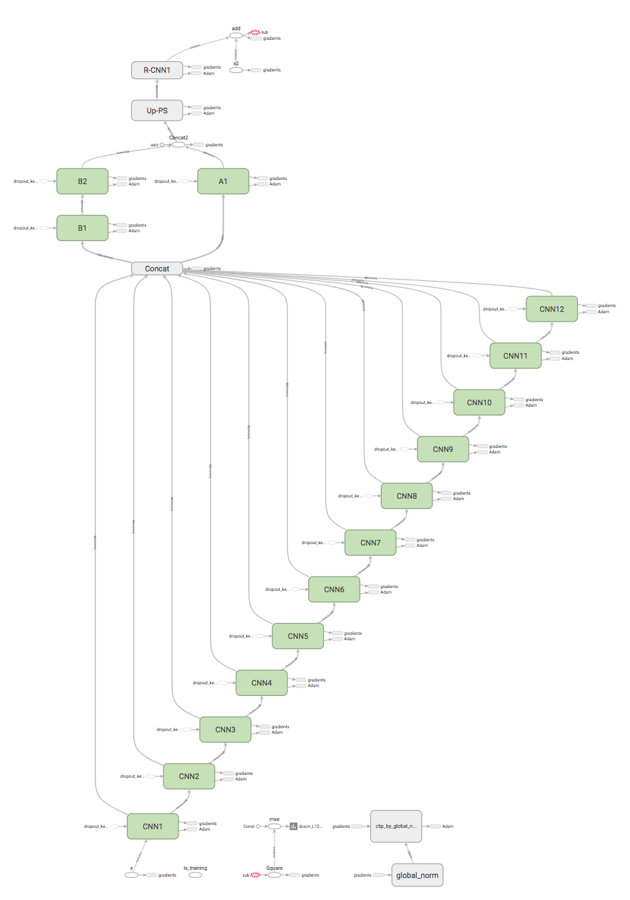 模型结构如下所示。我们使用了带有残差网络、跳跃连接和网络内网络的深度CNN。深度CNN与跳跃连接层的组合被用作提取局部和全局图像特征的特征提取器。同时,类似于“网络内网络”的并行化1×1卷积网络也被用于图像重建。