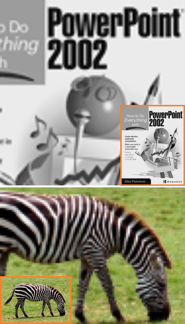 | 输入图像(橙色)与x4双三次插值 | 我们的DCSCN输出 |
