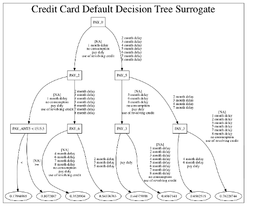 梯度提升机(GBM)及其他复杂机器学习模型是广受欢迎且精准的预测工具,但其决策过程往往难以理解。通过代理模型、特征重要性和原因代码,我们可以更好地解释这些模型并提高其透明度。在本笔记本中,我们将基于 UCI 信用卡违约数据训练一个 GBM 模型,随后使用原始输入及 GBM 的预测结果来训练一棵决策树代理模型。通过分析代理模型所展示的变量重要性和交互作用,我们可以获得该复杂模型预测的整体近似流程图。此外,我们还将评估 GBM 的全局特征重要性,并将其与代理模型、领域专业知识以及合理预期进行对比。