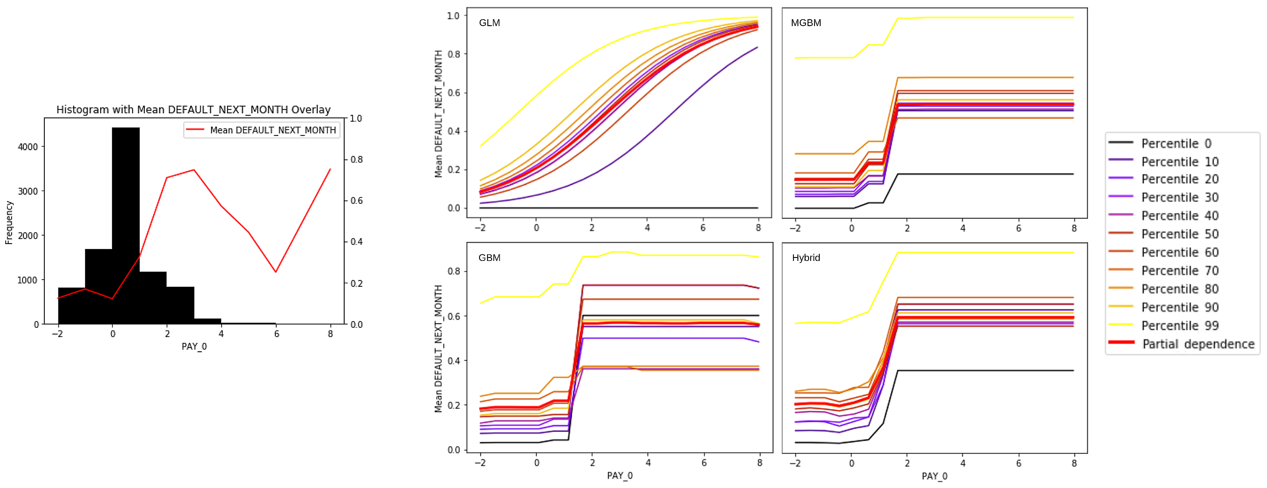 一旦我们训练好了一个单调的 XGBoost 模型,我们将使用部分依赖图和个体条件期望(ICE)图来探究模型的内部机制,并验证其单调行为。部分依赖图展示了机器学习响应函数如何根据一两个感兴趣的输入变量的取值而变化,同时平均掉了其他所有输入变量的影响。ICE 图则可以用来更局部地描述模型的预测结果,而且 ICE 图与部分依赖图相辅相成。此外,还展示了一个从高精度 Shapley 解释中生成监管部门要求的原因代码的例子,适用于任何模型预测。单调 XGBoost、部分依赖图、ICE 图和 Shapley 解释的结合,很可能是当今创建可解释机器学习模型最直接的方式之一。