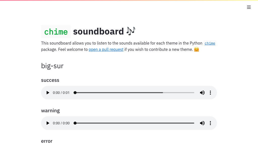 ![]() chime soundboard⭐ 63 · :octocat: 代码 轻松实现 Python 音效通知 由 @MaxHalford 提供 | ![]() 音乐生成⭐ 3 · :octocat: 代码 基于神经网络的音乐生成 Streamlit 应用 由 @Sohaib90 提供 |