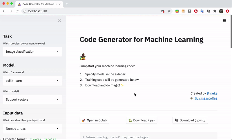 ![]() Traingenerator⭐ 990 · :octocat: 代码 一款用于生成机器学习模板代码的 Web 应用 由 @jrieke 提供 | ![]() FastAPI 模型服务⭐ 110 · :octocat: 代码 一个使用 Streamlit 和 FastAPI 来部署 PyTorch 模型的简单示例 Web 应用 由 @davidefiocco 提供 | ![]() PyTorch 全流程 ML 应用⭐ 69 · :octocat: 代码 一个端到端的 ML 应用,结合了 PyTorch、Weights & Biases、FastAPI、Docker、Streamlit 和 Heroku... 由 @madewithml 提供 |