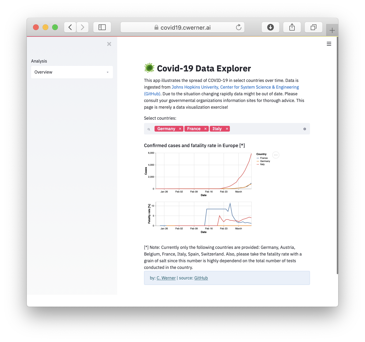 ![]() FarolCovid⭐ 37 · :octocat: 代码 . 监测巴西各城市医疗系统崩溃风险的工具... 由 @ImpulsoGov 提供 | ![]() Covid-19 数据探索器⭐ 19 · :octocat: 代码 Covid19 疫情传播情况的仪表盘 由 @cwerner 提供 | ![]() 基因祖先分析⭐ 19 · :octocat: 代码 可视化你的个人基因数据 由 @arvkevi 提供 |