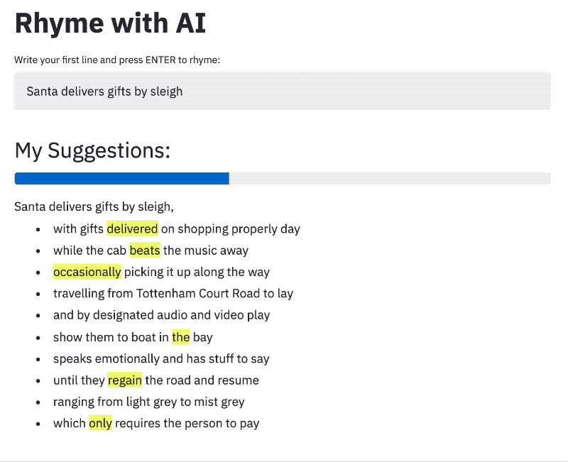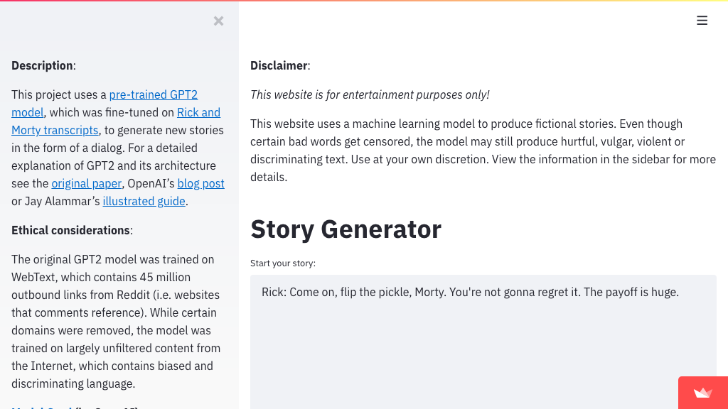 ![]() 瑞克与莫蒂生成器⭐ 19 · :octocat: 代码 一款使用 GPT2 生成瑞克与莫蒂故事的 Streamlit 应用 由 @e-tony 提供 | ![]() Headliner 演示⭐ 17 · :octocat: 代码 简单的翻译演示,展示了我们的 headliner 包 由 @as-ideas 提供 | ![]() 与 AI 押韵⭐ 16 · :octocat: 代码 与 AI 押韵 由 @godatadriven 提供 |