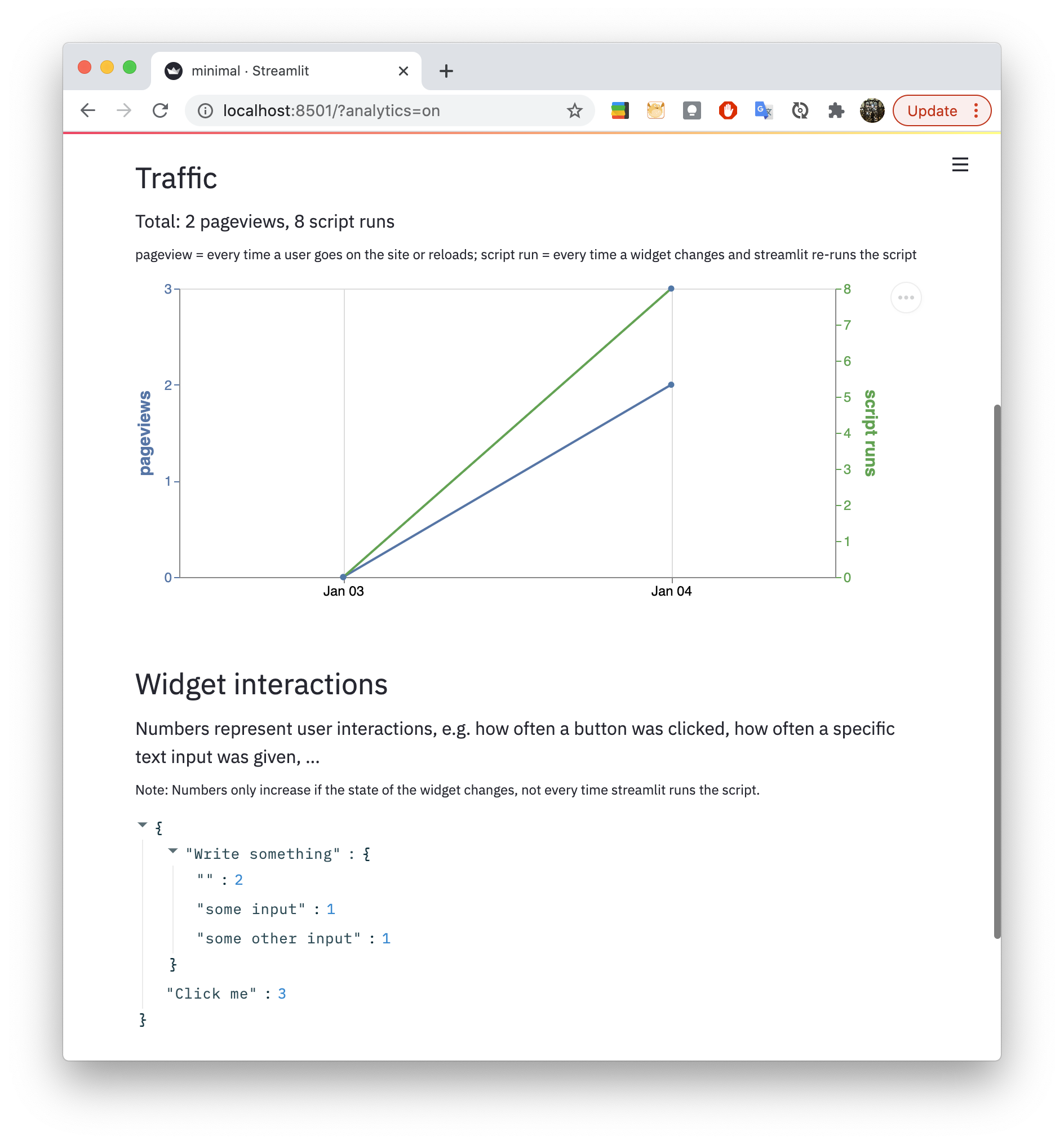 ⭐ 59 · :octocat: 代码 Pandas 数据分析报告组件,适用于 Streamlit 由 @okld 提供 ⭐ 57 · :octocat: 代码 使用 Terran 创建视频时间线 由 @pento-group 提供 ⭐ 49 · :octocat: 代码 包含 Ace 代码编辑器的 Streamlit 组件 由 @okld 提供 ⭐ 48 · :octocat: 代码 用于与 Bokeh 图表进行双向通信的 Streamlit 组件 由 @ash2shukla 提供 ⭐ 36 · :octocat: 代码 Streamlit 图形可视化组件 由 @ChrisChross 提供 ⭐ 31 · :octocat: 代码 D3 在 React 中运行的 Streamlit 技术演示 由 @andfanilo 提供 ⭐ 30 · :octocat: 代码 用于渲染交互式 Vega、Vega-Lite 和 Altair 可视化效果的 Streamlit 组件…… 由 @domoritz 提供 ⭐ 28 · :octocat: 代码 将 Observable 笔记本嵌入到 Streamlit 应用中! 由 @asg017 提供 ⭐ 28 · :octocat: 代码 一个简单的 Streamlit 图像裁剪组件 由 @turner-anderson 提供 ⭐ 28 · :octocat: 代码 在 DS-OX 聚会上分享的内容 由 @asehmi 提供 ⭐ 21 · :octocat: 代码 跟踪并可视化用户与您的 Streamlit 应用的互动情况 由 @jrieke 提供 ⭐ 16 · :octocat: 代码 用于嵌入代码片段(如 GitHub Gist、CodePen 片段等)的 Streamlit 组件 由 @randyzwitch 提供 ⭐ 15 · :octocat: 代码 用于渲染 Lottie 动画的 Streamlit 组件 由 @andfanilo 提供 ⭐ 14 · :octocat: 代码 该项目旨在提供一种简便的方法来创建用于交互式分子展示的 Web 应用程序。 由 @napoles-uach 提供 🐣 新项目 · ⭐ 8 · :octocat: 代码 一个简单的 Streamlit 组件,用于在 Streamlit 应用中显示时间线。它集成了 Kn... 由 @innerdoc 提供 ⭐ 6 · :octocat: 代码 一个用于嵌入来自不同网站的视频和音乐播放器的 Streamlit 组件 由 @okld 提供 ⭐ 2 · :octocat: 代码 一个用于在您的应用中嵌入 Disqus 的 Streamlit 组件 由 @okld 提供 ⭐ 1 · :octocat: 代码 一个用于在您的应用中嵌入 Discourse 论坛主题的 Streamlit 组件 由 @okld 提供显示“🧰 扩展与组件”下的另外 18 项
