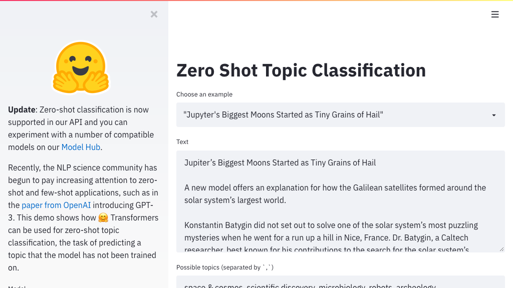 ⭐ 2 · :octocat: 代码 展示如何将 Streamlit 与词嵌入结合使用的演示项目 由 @dkajtoch 提供 此演示展示了如何使用 Transformer 进行零样本主题分类,该技...显示更多关于“📚 自然语言处理”的内容(2项)