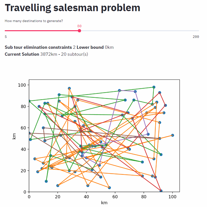 ![]() 营销活动应用⭐ 12 · :octocat: 代码 一个 Streamlit 应用演示(Python、Plotly) 由 @Ivyw1219 提供 | ![]() 旅行商问题⭐ 3 · :octocat: 代码 使用混合整数规划求解旅行商问题并达到最优解的动画 由 @miclindahl 提供 |