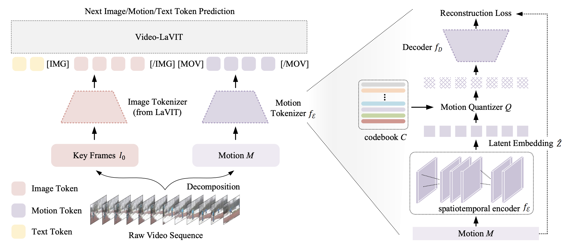 2024.06.01👏👏👏 Video-LaVIT 已被 ICML 2024 接受为口头报告!2024.04.21🚀🚀🚀 我们已在 HuggingFace 上发布了 Video-LaVIT 的预训练权重,并提供了推理代码。2024.02.05🌟🌟🌟 我们提出了 Video-LaVIT:一种高效的多模态预训练方法,使大型语言模型能够在统一框架下理解和生成视频内容。2024.01.15👏👏👏 LaVIT 已被 ICLR 2024 接受!2023.10.17🚀🚀🚀 我们在 HuggingFace 上发布了 LaVIT 的预训练权重,并提供了用于多模态理解和生成的推理代码。