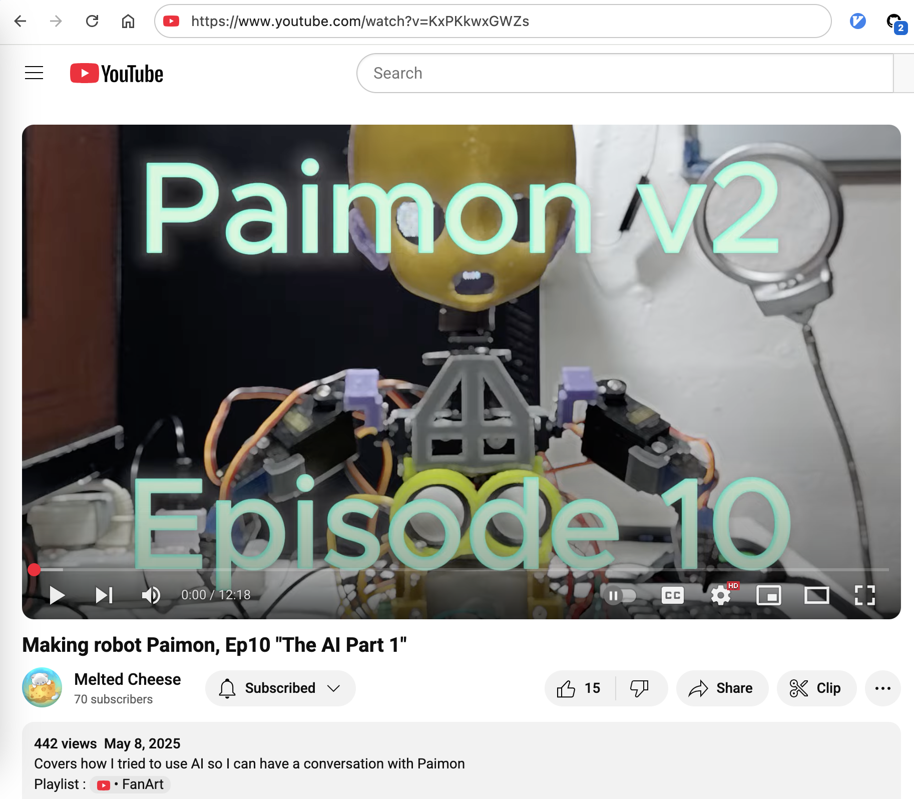 这是一段 YouTube 视频, 展示了作者如何尝试利用 AI 与派蒙进行对话。