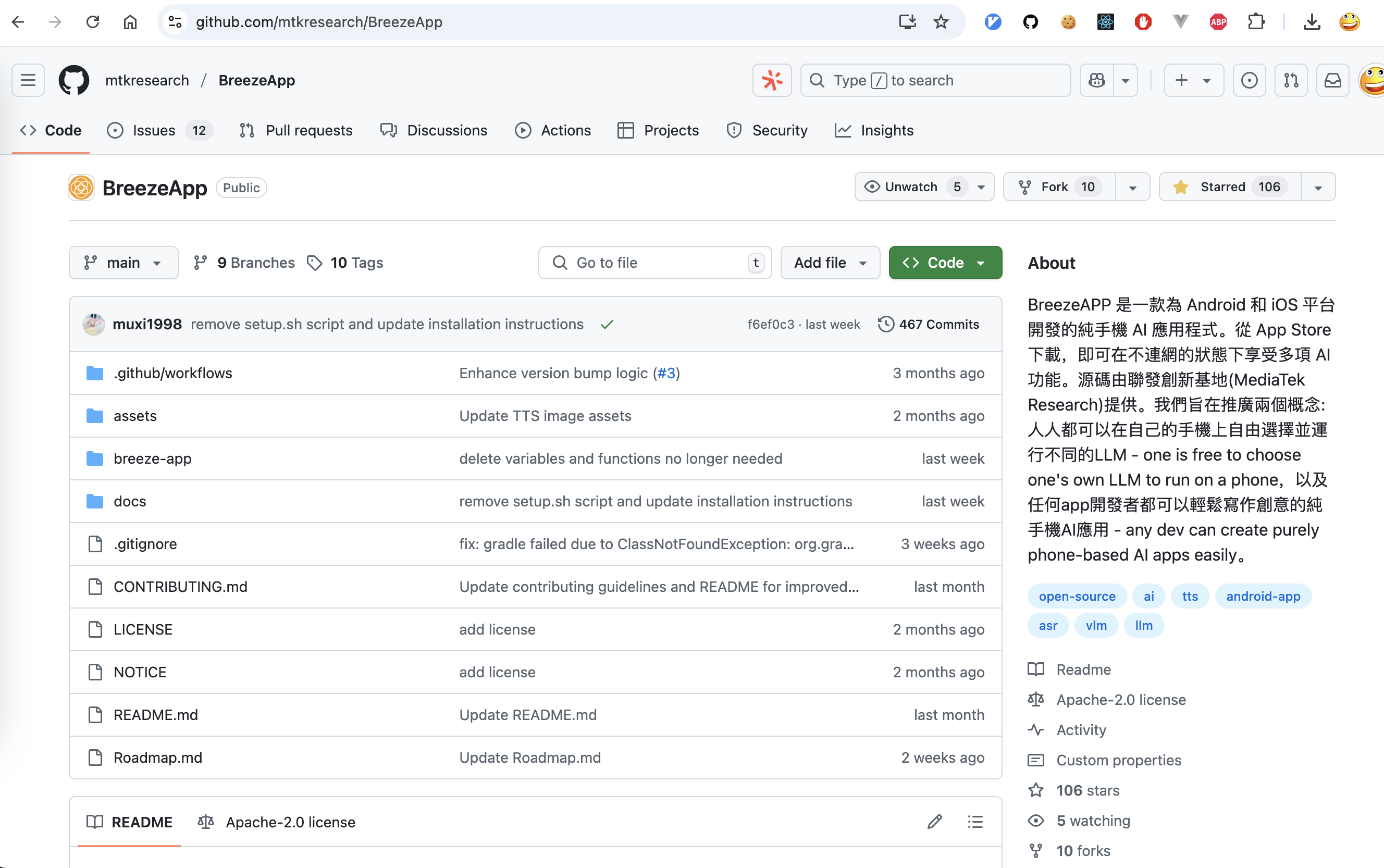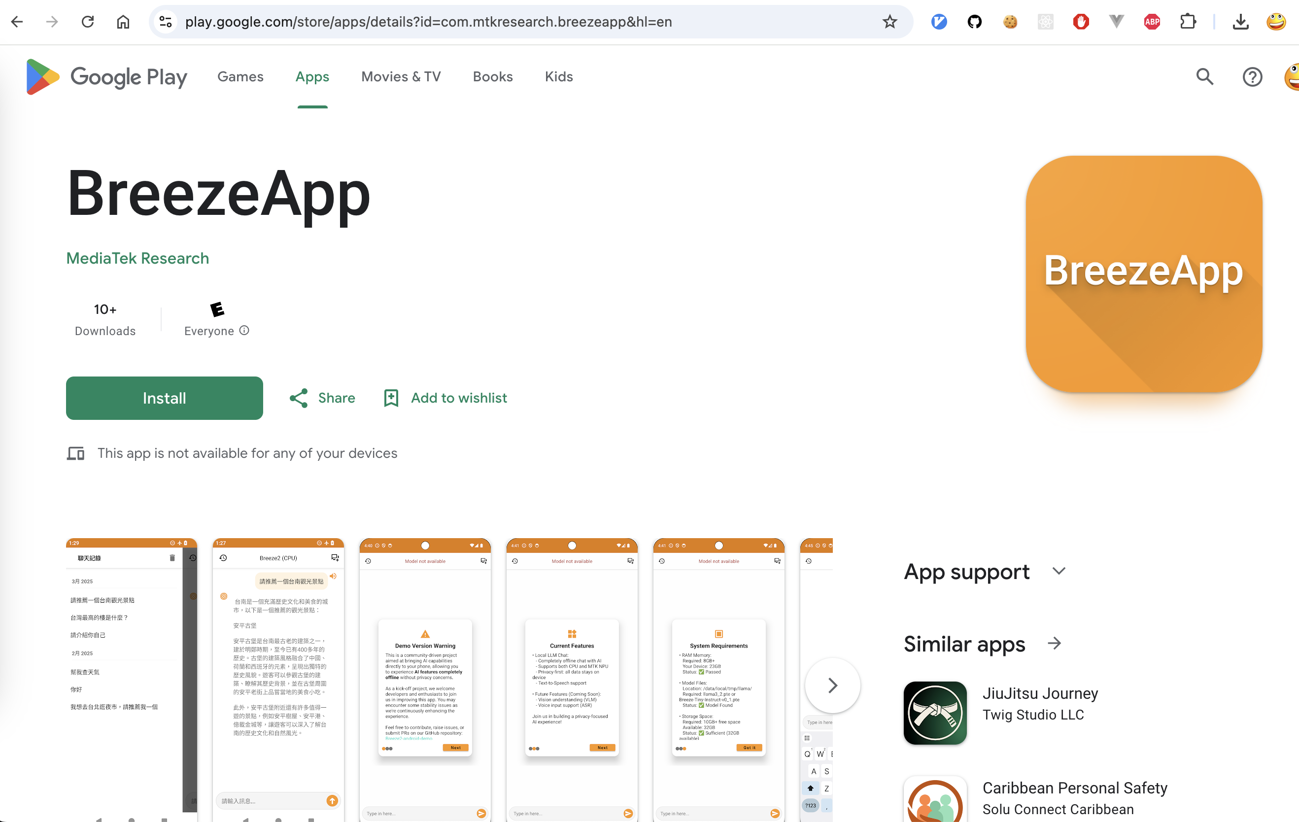 BreezeAPP 是一款为 Android 和 iOS 平台开发的移动 AI 应用程序。 用户可以直接从 App Store 下载,并在离线状态下享受多种功能, 包括语音转文本、文本转语音、基于文本的聊天机器人交互以及图像问答。