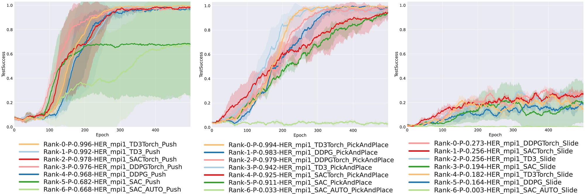 4种tf,3种torch的HER算法在三个操作任务的测试结果。