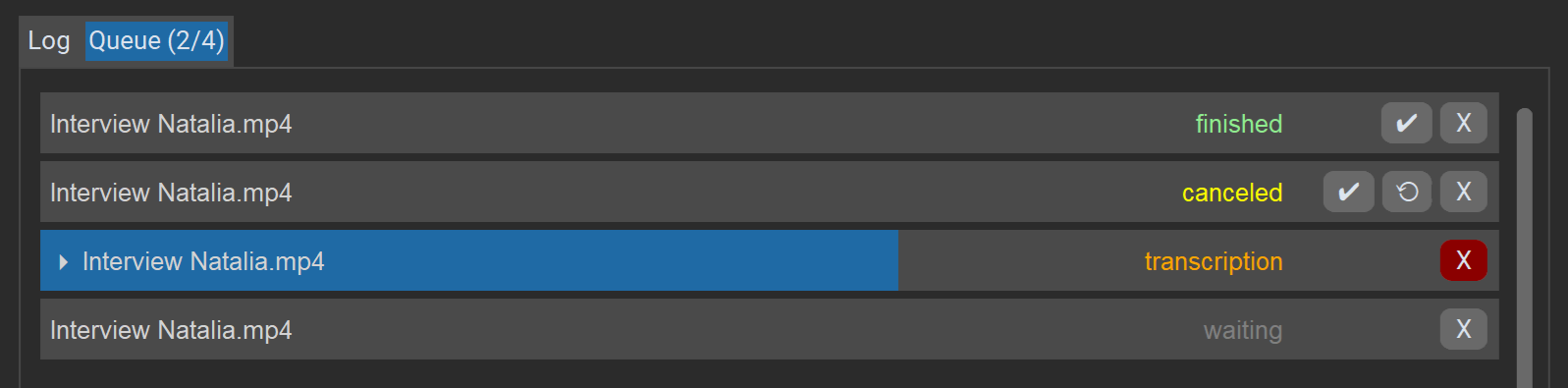 X从列表中删除任务,或取消正在运行的任务。✔在内置编辑器中打开转录文件。即使任务因错误或用户取消而未完成,也可通过此按钮查看转录内容。⟲重新启动任务(仅在出现错误或任务被取消时可用)。