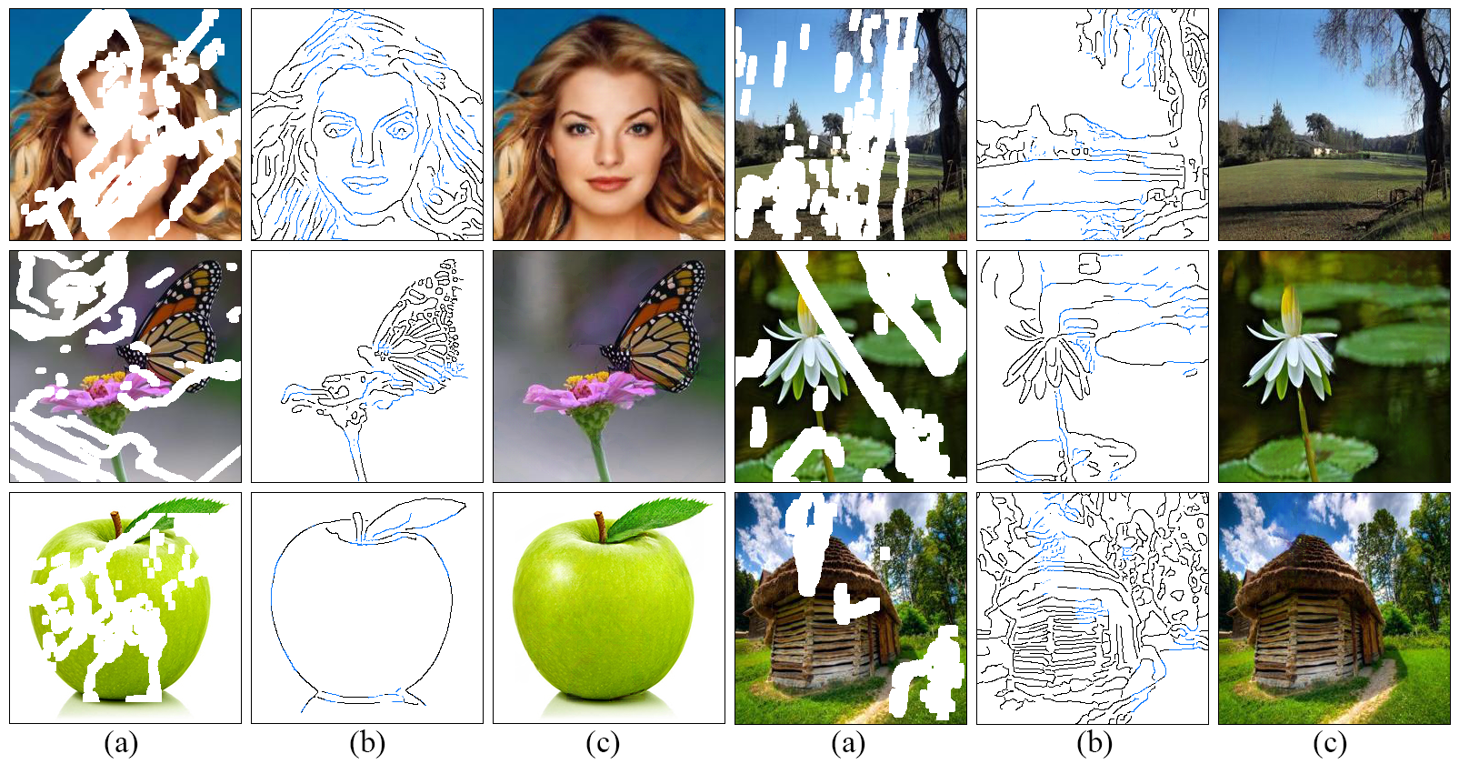 我们提出了一种新的图像修复方法,该方法能够更好地复原包含精细细节的填充区域。这一方法受到艺术家创作方式的启发——“先勾勒线条,再上色”。我们设计了一个两阶段的对抗模型EdgeConnect,它由一个边缘生成器和一个图像补全网络组成。边缘生成器会为图像中缺失的部分(包括规则和不规则的边缘)“幻化”出边缘信息,而图像补全网络则以这些“幻化”的边缘作为先验信息来填充缺失区域。系统的详细描述请参阅我们的论文此处。