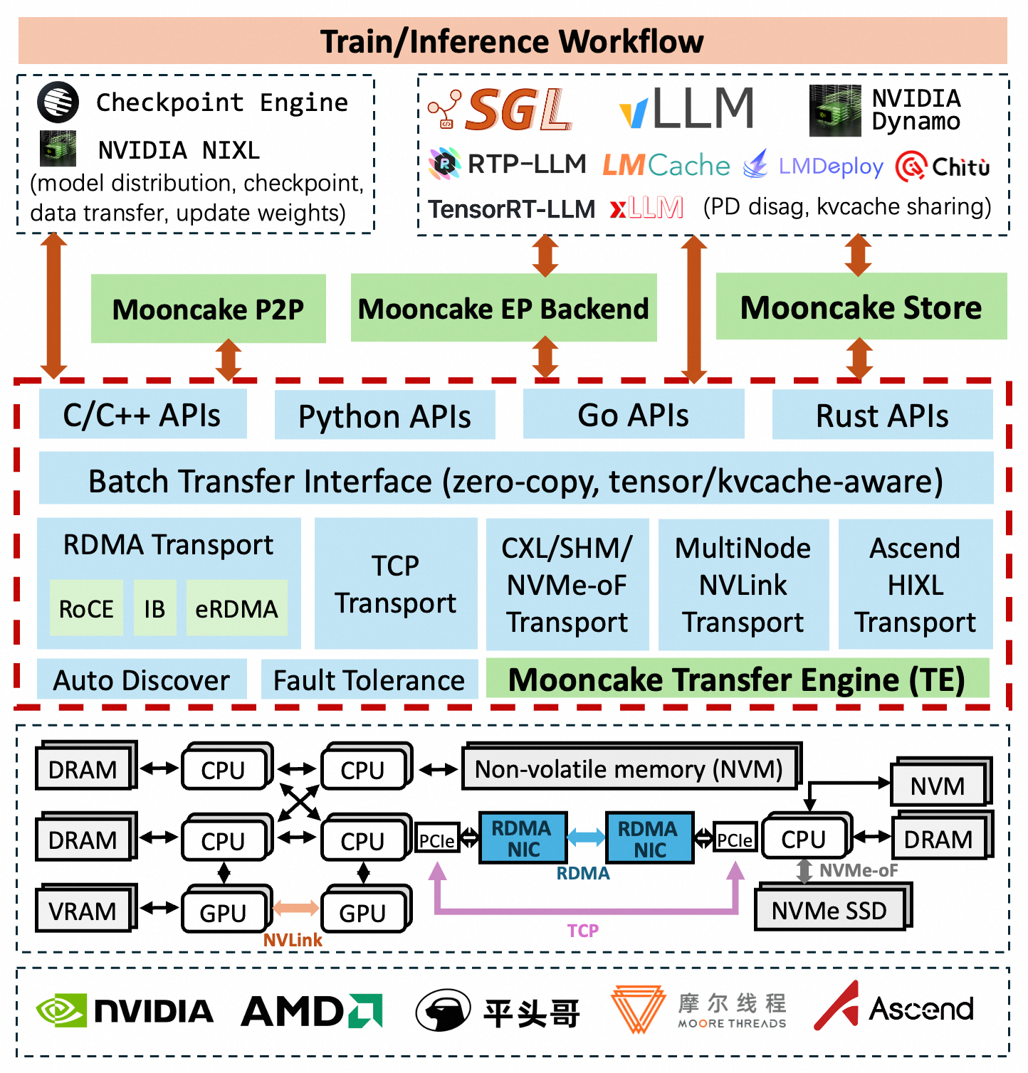 - 2026年1月28日: FlexKV,由腾讯和 NVIDIA 联合社区开发的分布式 KV 存储与缓存系统,现已支持使用 Mooncake Transfer Engine 进行 分布式 KVCache 复用。