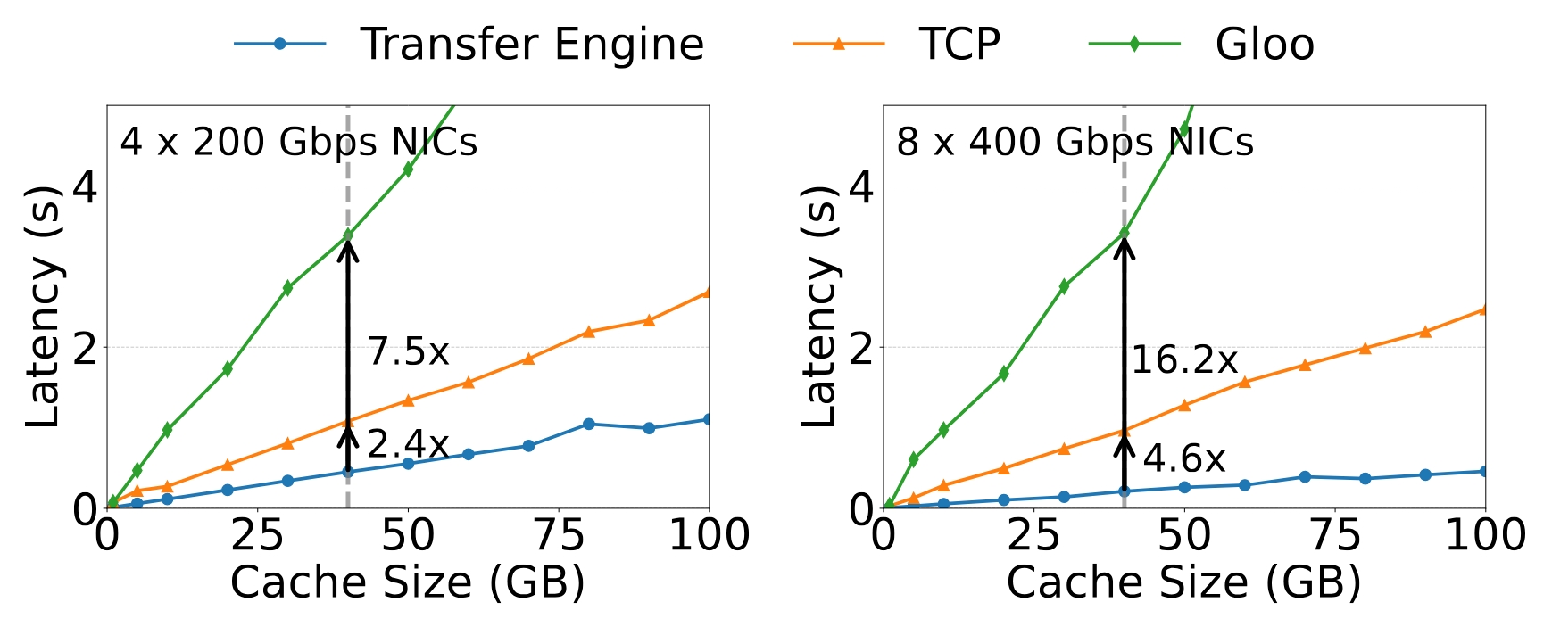 我们已经实现了 vLLM 集成,该集成使用 Transfer Engine 作为网络层,而非 nccl 和 gloo,以支持 节点间 KVCache 传输 (PR 10884)。Transfer Engine 提供更简单的接口和更高效的 RDMA 设备使用方式。
