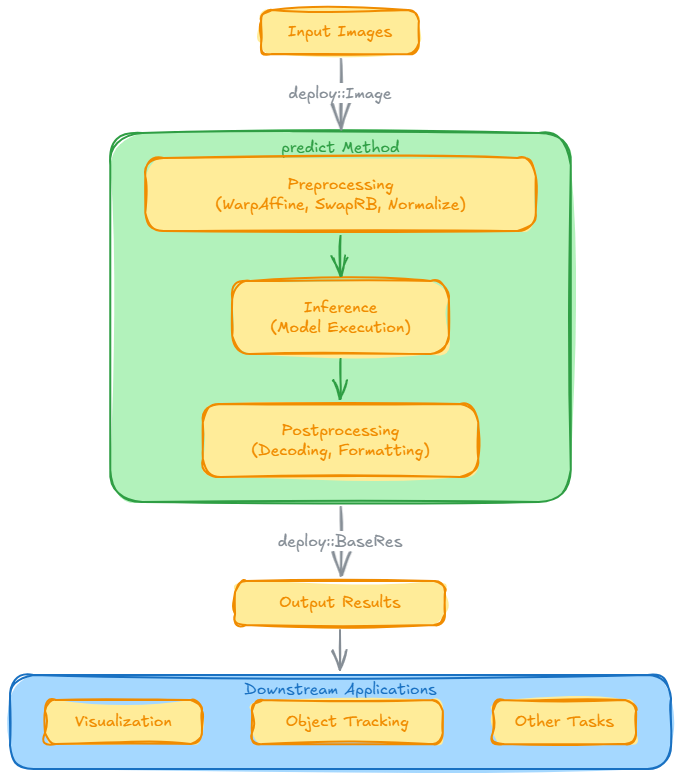 只需将待推理的图片传递给 predict 方法,predict 内部会自动完成预处理、模型推理和后处理,并输出推理结果,这些结果可进一步应用于下游任务(如可视化、目标跟踪等)。