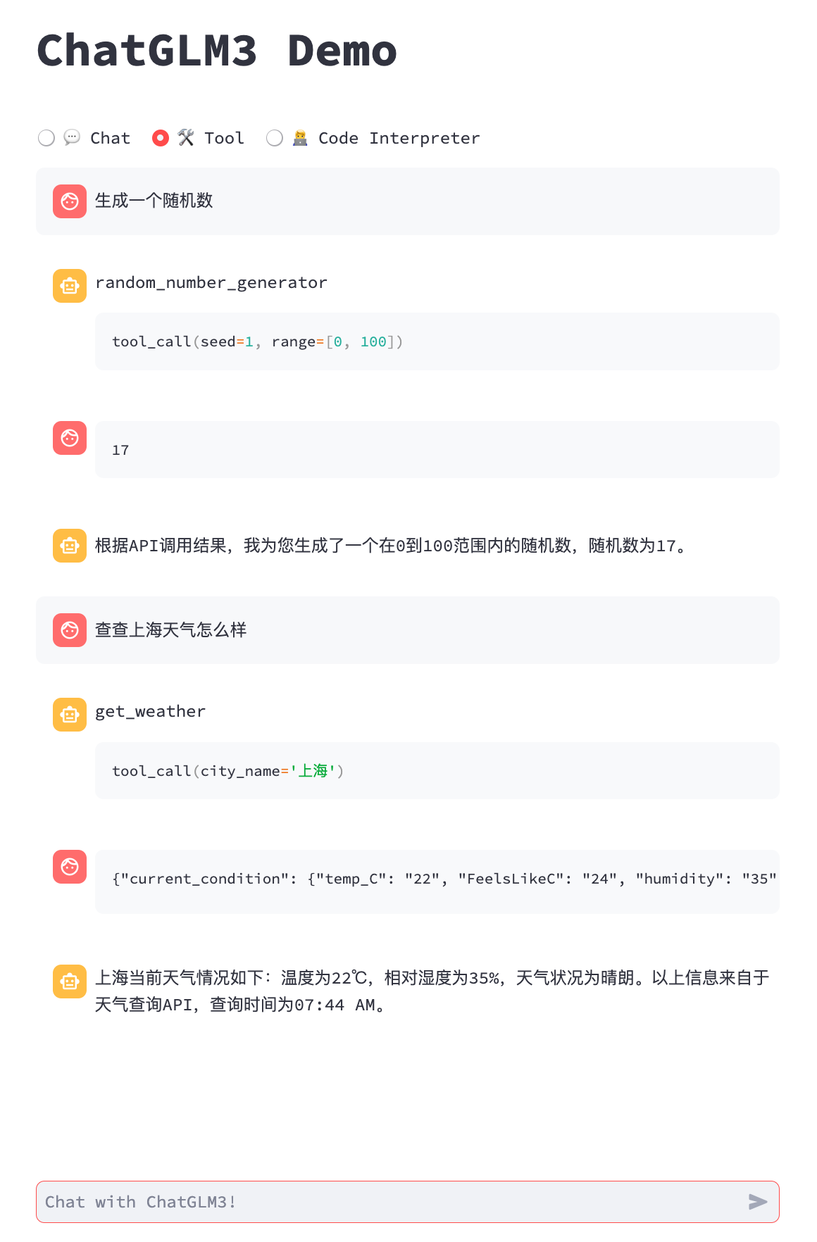 ChatGLM3-6B 在对话模式的基础上进一步支持函数调用和代码解释器功能。
