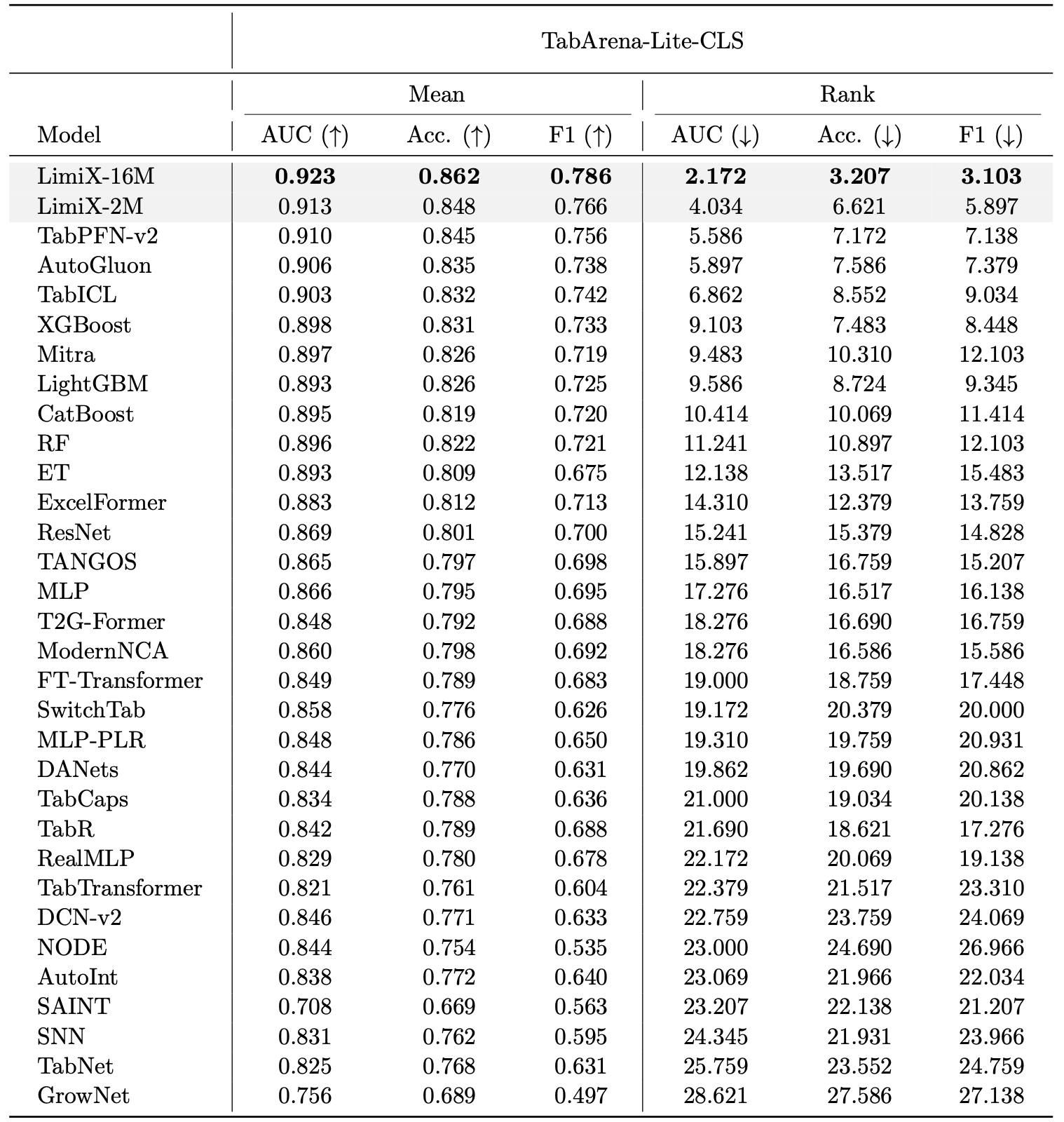 有关详细信息,请参阅以下技术报告:LimiX:释放结构化数据建模能力,助力通用智能 或 LimiX_Technical_Report.pdf。