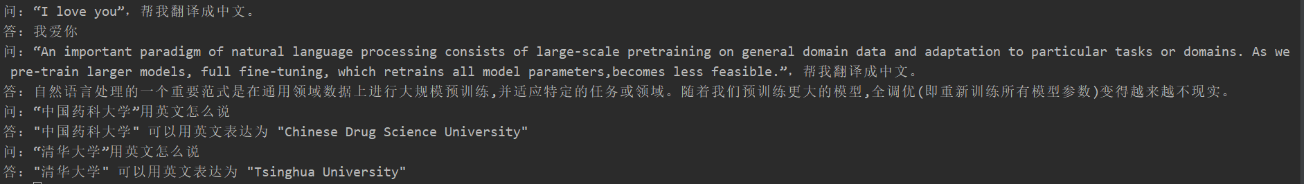 很多同学在微调后出现了灾难性遗忘现象,但本项目的训练代码并没有出现,对“翻译任务”、“代码任务”、“问答任务”进行测试,具体测试效果如下: