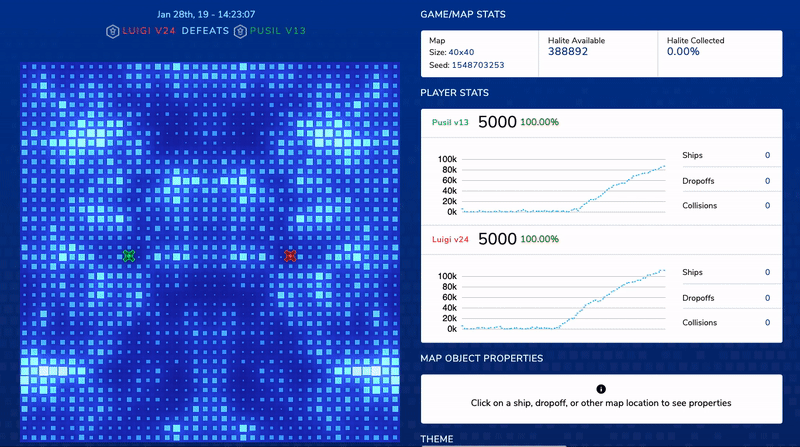 每位玩家初始拥有5,000单位的“halite”储备、一座船厂以及对游戏地图的了解。每局游戏由两至四名玩家参与,在一个具有独特对称图案的二维地图上进行。船只每回合只能执行一项操作:向任意一个基本方向移动一格、在当前位置采集“halite”,或转换为卸货点。当船只位于己方船厂或卸货点上方时,会自动卸下所携带的“halite”,从而增加玩家的总储量。