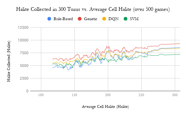 我们的结果表明,两款机器学习机器人能够较好地学习卤石采集行为,其表现与两个基准机器人相当。此外,经过遗传优化的机器人在所有地图密度下均优于其他机器人。DQN机器人在低卤石密度的地图上表现优于基于规则的机器人,但在中高密度地图上则与之持平。而SVM机器人在低卤石密度的游戏场景中表现与基于规则的机器人相近,但在中高密度场景中则整体落后于其他机器人。