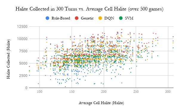 对于四款机器人各自进行的500场比赛,我们记录了每场比赛中总沉积的卤石数量以及地图上每个单元格的平均卤石含量。图2展示了这2000个数据点的散点图,其中X轴为每个单元格的平均卤石含量,Y轴为总采集的卤石数量。图3则呈现了同一组数据的16期移动平均线。我们选择这一指标,是因为卤石分布密集的地图自然会导致更高的总采集量,因此仅比较500场比赛的平均采集量并不足以全面评估表现。