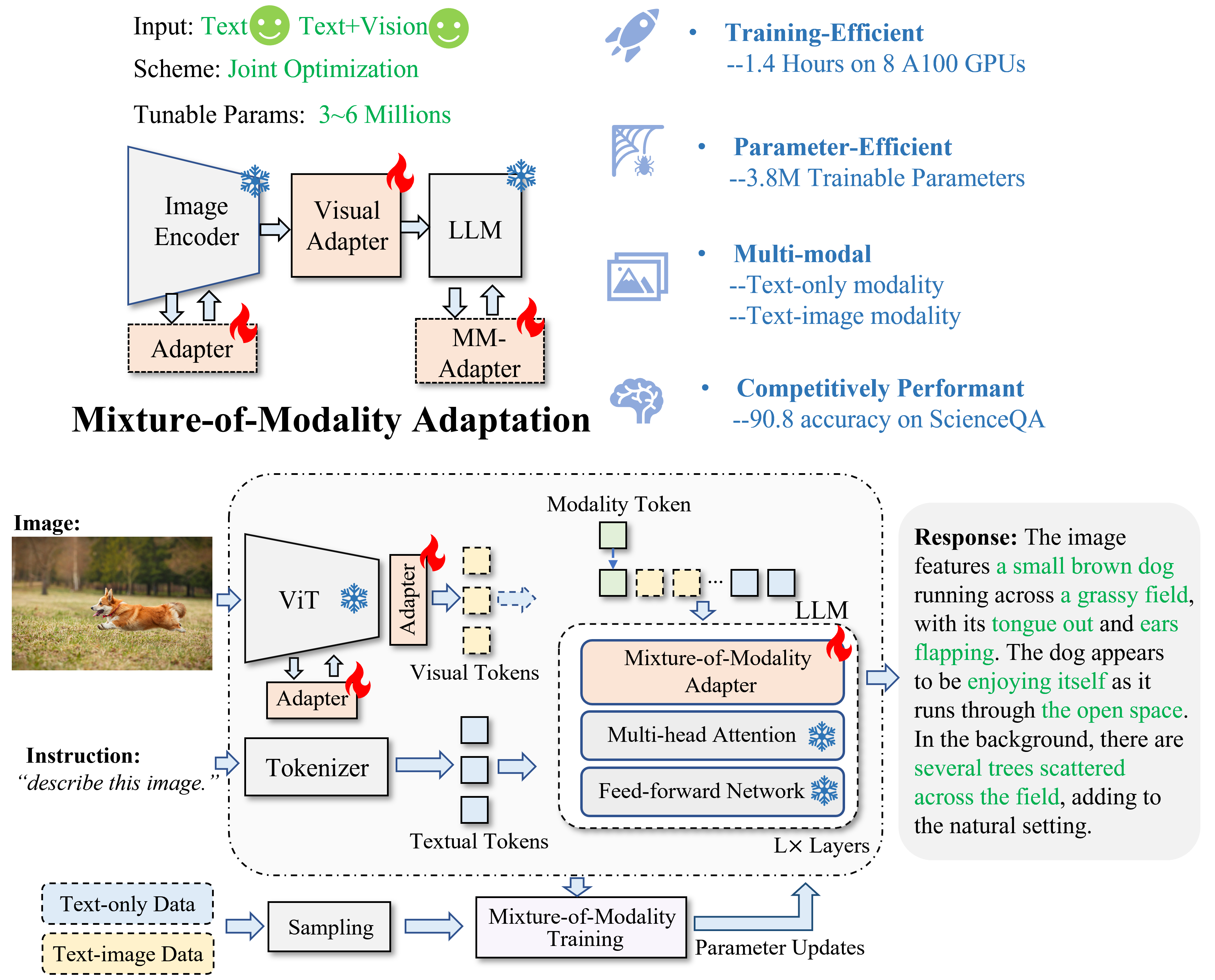 - 极致降本增效:借助混合模态适配(MMA)技术,仅需训练 380 万参数(约占总量的 0.5%),大幅降低算力预算。