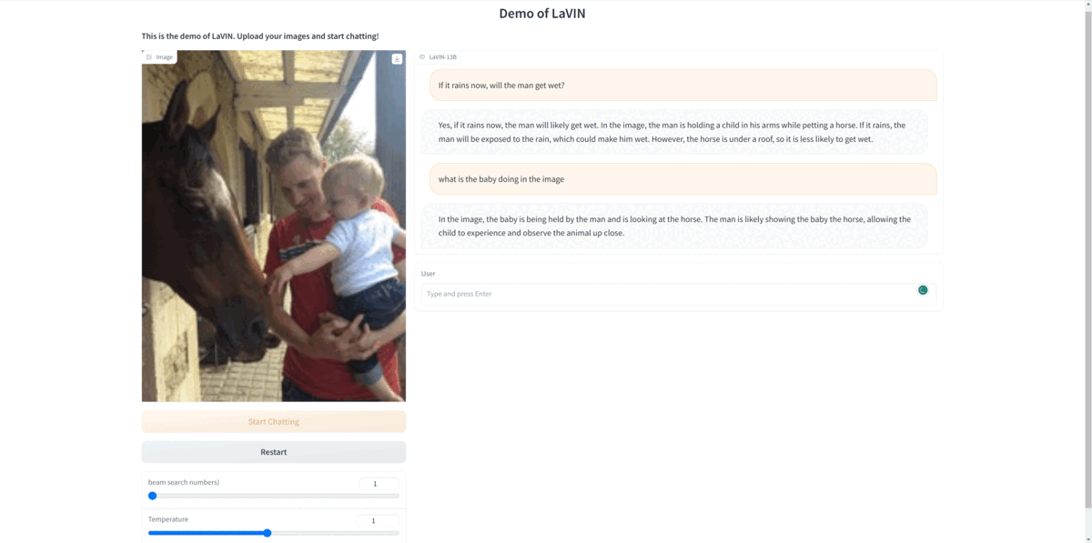 - 在您的机器上启动一个 Gradio Web 服务器,然后您可以随意与 LaVIN 互动。