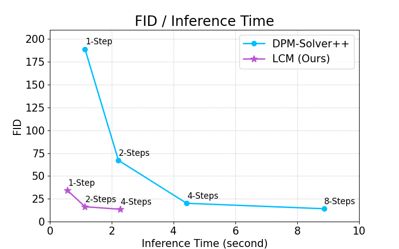 通过将无分类器引导 (classifier-free guidance) 蒸馏到模型的输入中,LCM 可以在极短的推理时间内生成高质量图像。我们在 768 x 768 分辨率、CFG scale w=8、batchsize=4、使用 A800 GPU 的设置下比较了推理时间。