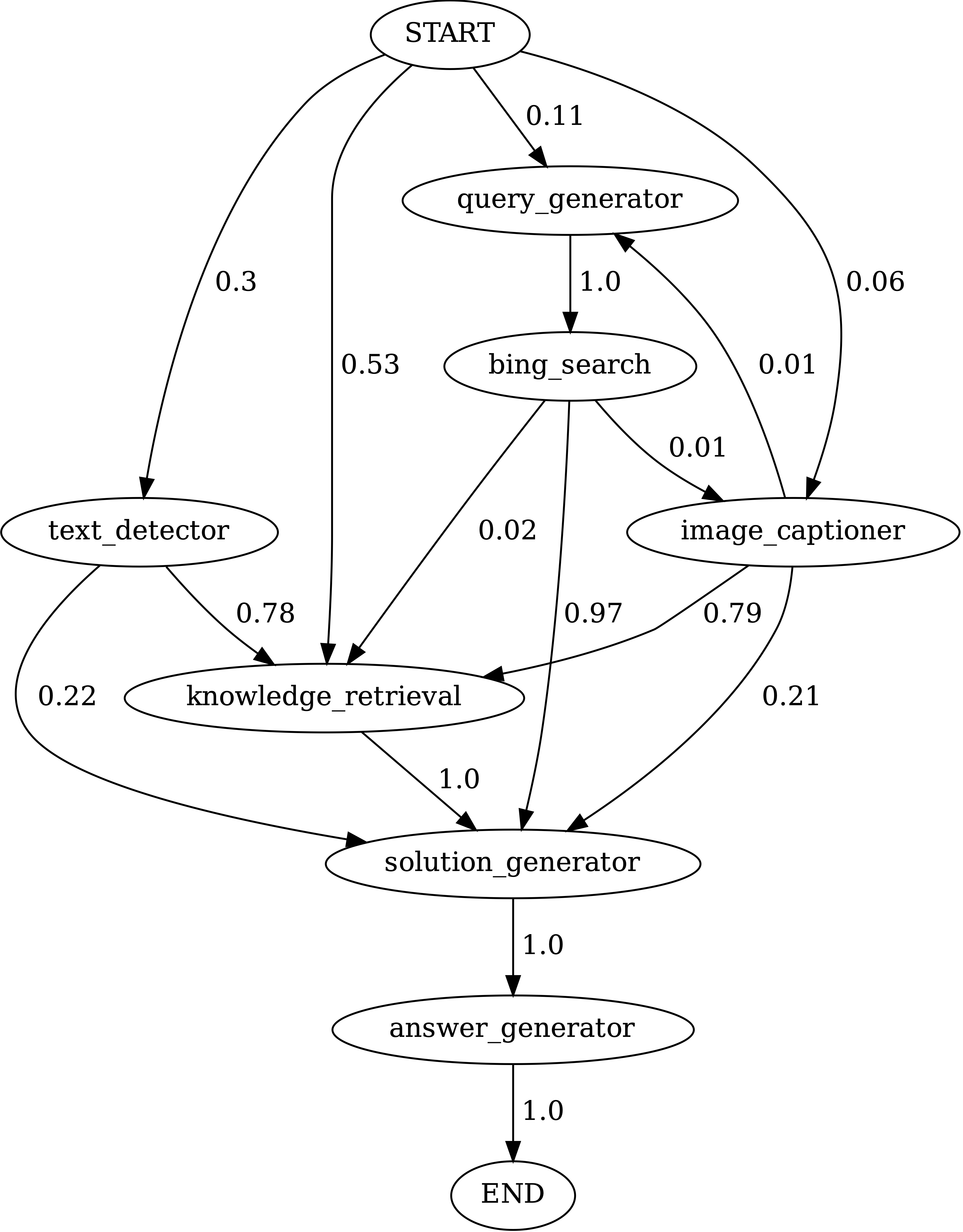 这是 Chameleon (GPT-4) 在 ScienceQA 数据集上生成的程序中模块之间的转移情况。START 是起始符号,END 是终结符号,其余均为非终结符号。