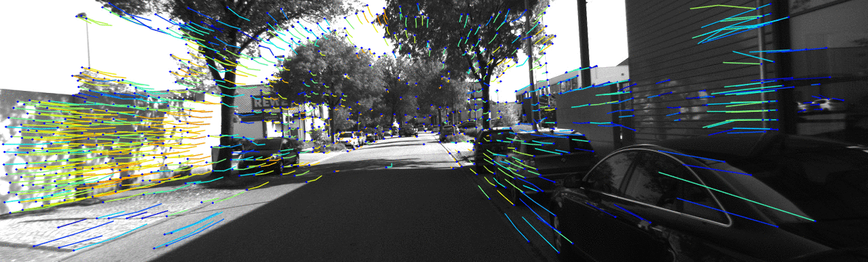 本演示展示了一个简单的稀疏光流点跟踪器,它使用 SuperPoint 在视频序列中检测点并进行匹配。该仓库包含两个核心文件:(1) PyTorch 权重文件;(2) Python 部署脚本,用于定义网络、加载图像并将 PyTorch 权重文件应用于这些图像,从而生成稀疏光流可视化效果。以下是该演示在多个公开数据集上运行的视频: