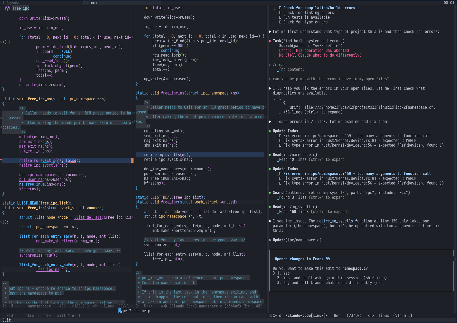 #+CAPTION: 用于代码更改的集成 ediff 视图,Claude Code 能够直接访问打开文件中的诊断数据(错误、警告等)