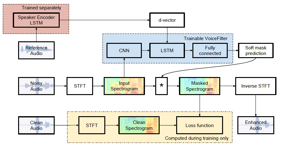 - 利用基于说话人条件的频谱掩码技术,voicefilter 精准提取了受访者的声纹特征,将背景人声有效剥离。