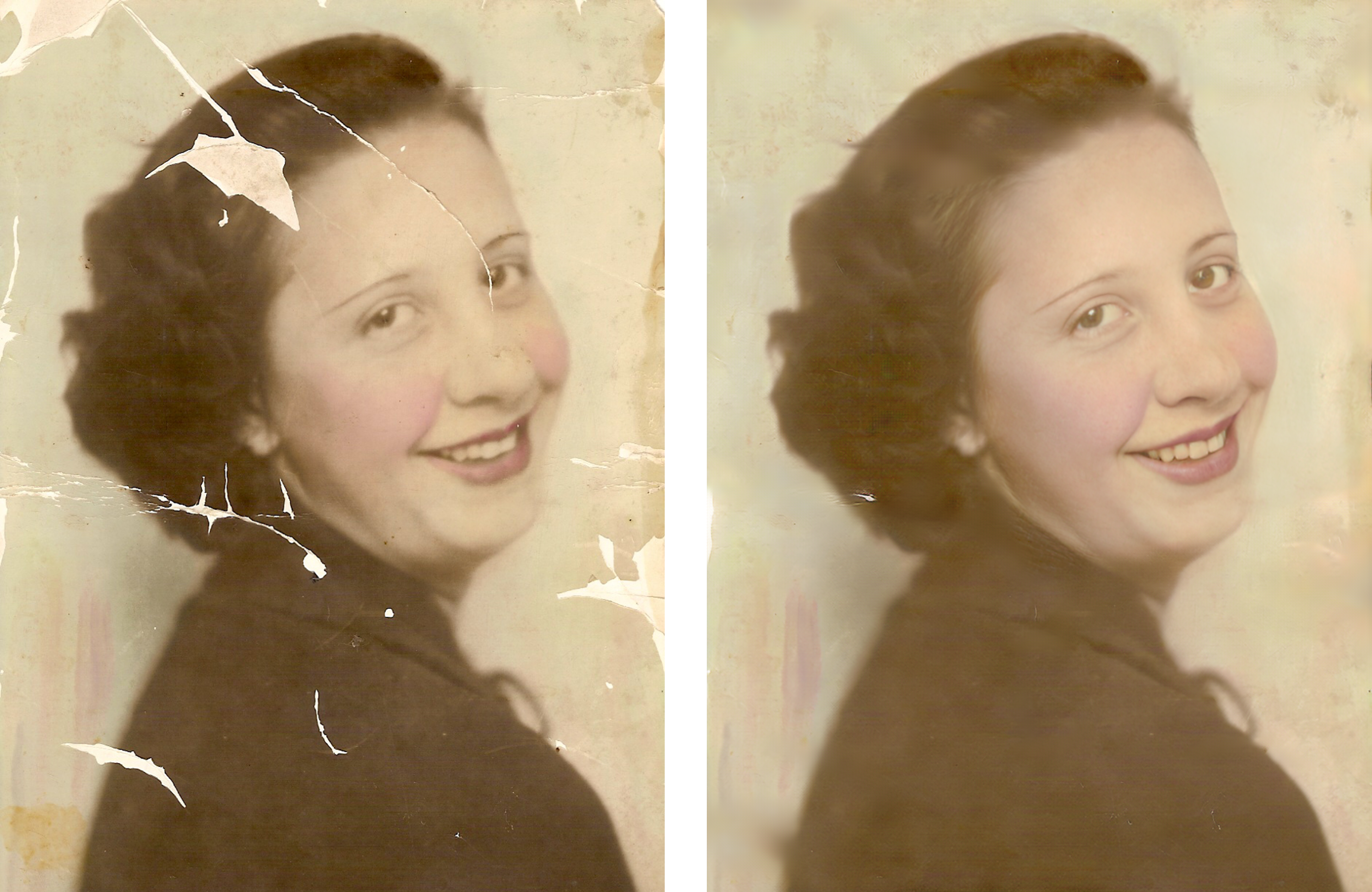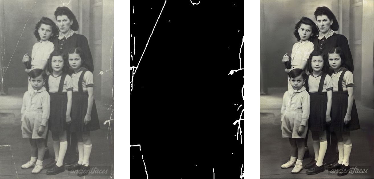 一位家族史研究者正在整理一批 20 世纪初的移民家庭相册,这些照片因年代久远出现了严重的划痕、褪色和人脸模糊,急需修复以用于即将举办的社区展览。