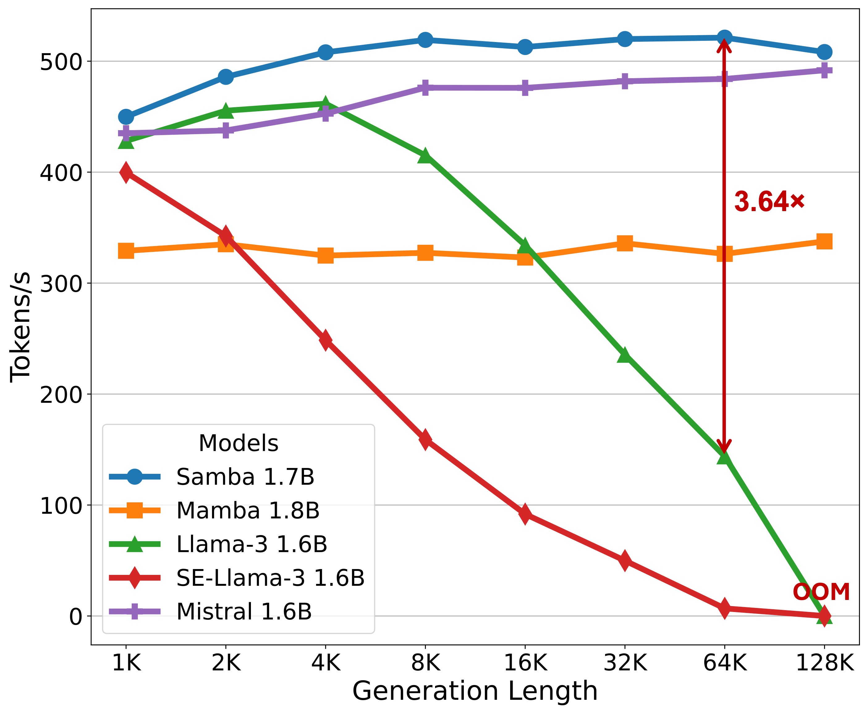 Samba 最独特的技术亮点在于其“极简却强大”的设计理念:通过简单的层级堆叠策略,不仅实现了比肩甚至超越同参数量级主流模型(如 Phi-3-mini)的性能,还在 MMLU、GSM8K 等权威基准测试中取得了显著优势。作为入选 ICLR 2025 的前沿成果,Samba 为构建下一代高效、无长度限制的语言模型提供了极具价值的新范式。