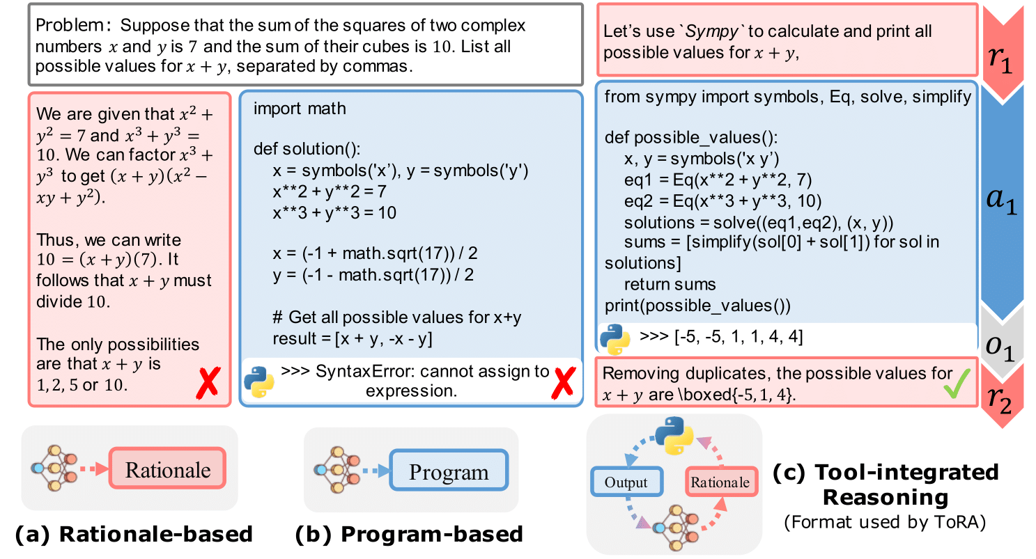 ToRA是一系列工具集成型推理代理,旨在通过与计算库、符号求解器等外部工具交互来解决具有挑战性的数学推理问题。ToRA系列将自然语言推理与外部工具的高效利用无缝结合,从而融合了语言的分析能力与外部工具的计算效率。