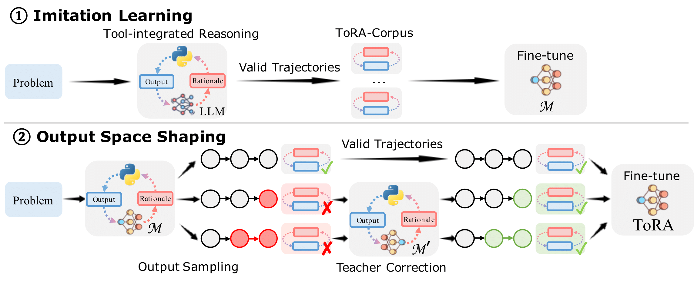 图3:ToRA的训练包含①模仿学习,以及②输出空间的优化。