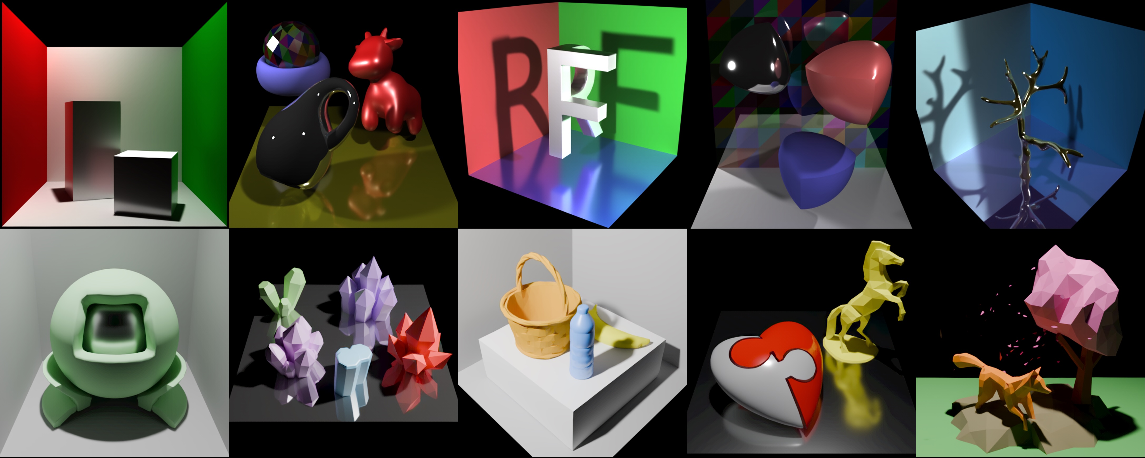 使用RenderFormer渲染的基于三角网格的场景示例,无需针对每个场景进行训练或微调,即可呈现(多重)镜面反射、复杂阴影、漫反射间接光照、光泽反射、软硬阴影以及多个光源。
