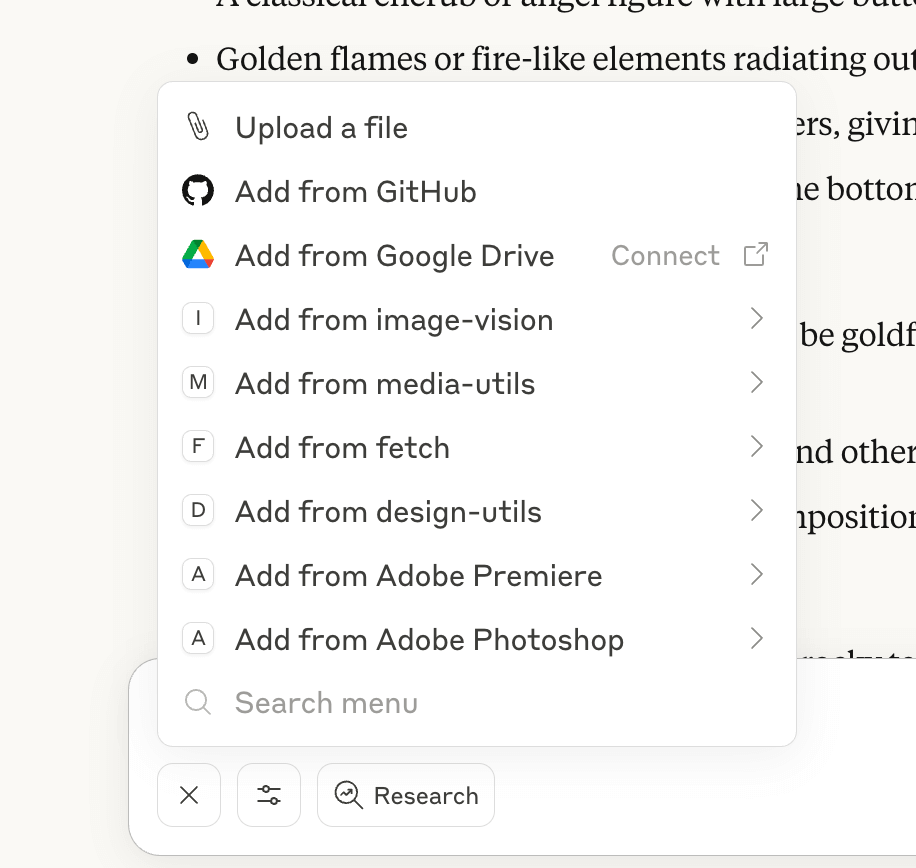 在聊天输入框中,点击“+”按钮。然后选择“从 Adobe Photoshop / Premiere 添加”,再选择 config://get_instructions。这会将指令加载到提示中。提交给 Claude,待其处理完毕后,您就可以开始使用了。