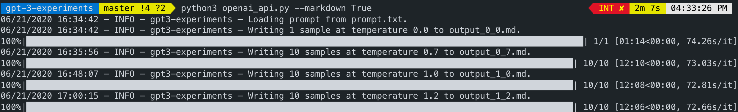 使用 gpt-3-experiments 后