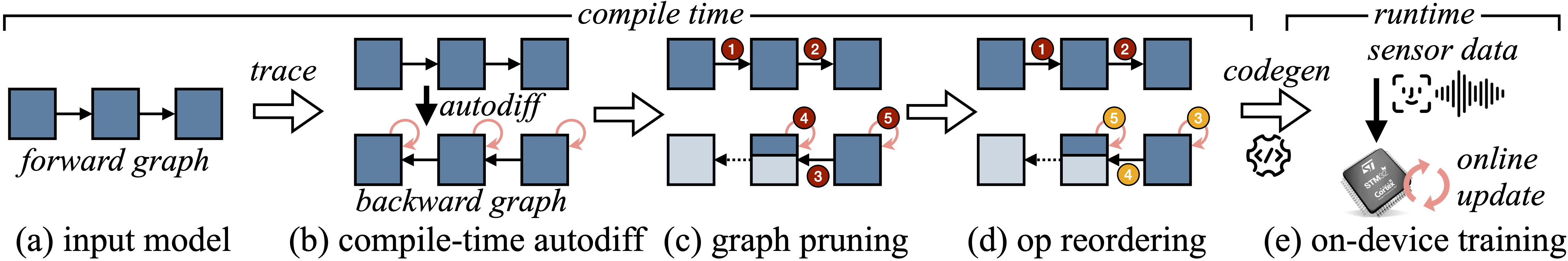 我们工作的另一大亮点是Tiny Training Engine(TTE),它将自动微分从运行时移至编译时,并通过代码生成来最小化运行时开销。同时,TTE还支持图剪枝和重排序,以实现稀疏更新,从而将理论上的节省转化为实际的内存占用减少和速度提升。