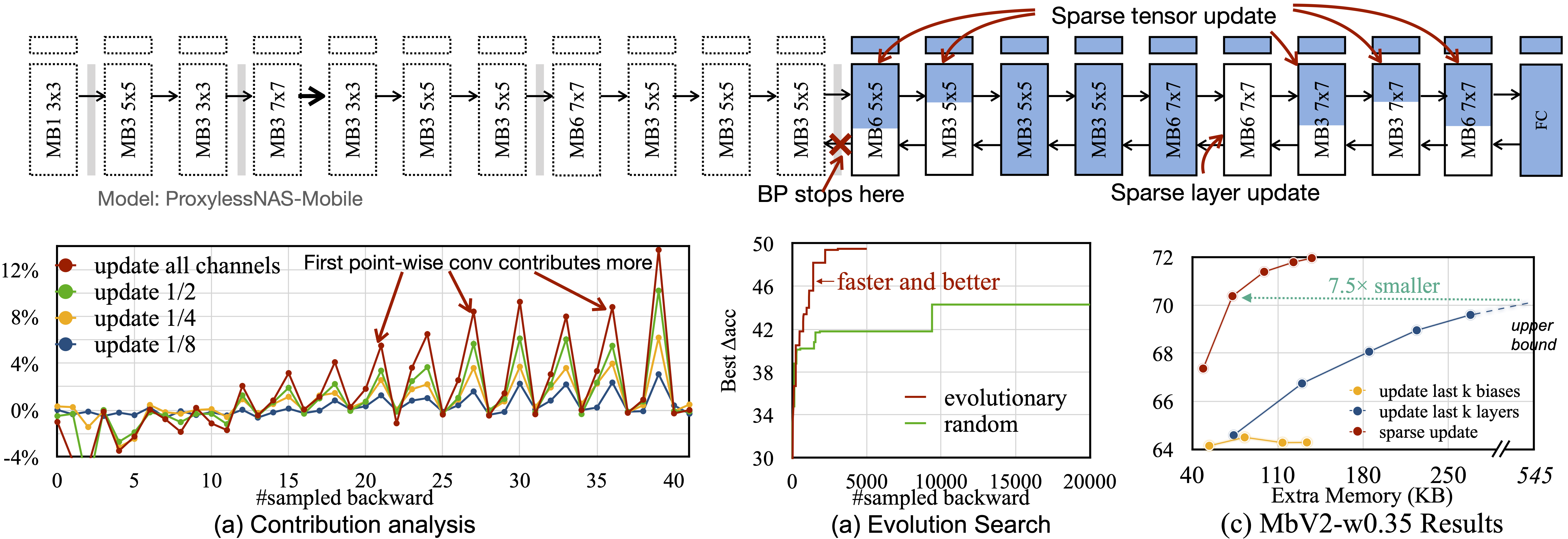 此外,我们还设计了稀疏层和稀疏张量更新机制,跳过不重要层和子张量的梯度计算。针对不同内存预算,我们基于贡献度分析,自动确定最佳的稀疏化程度。