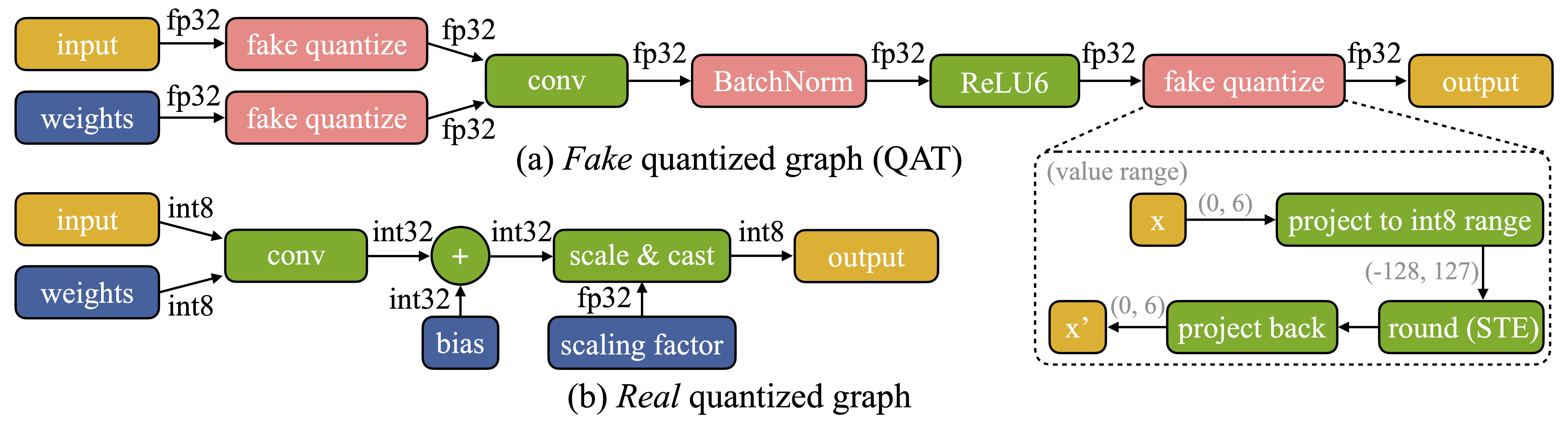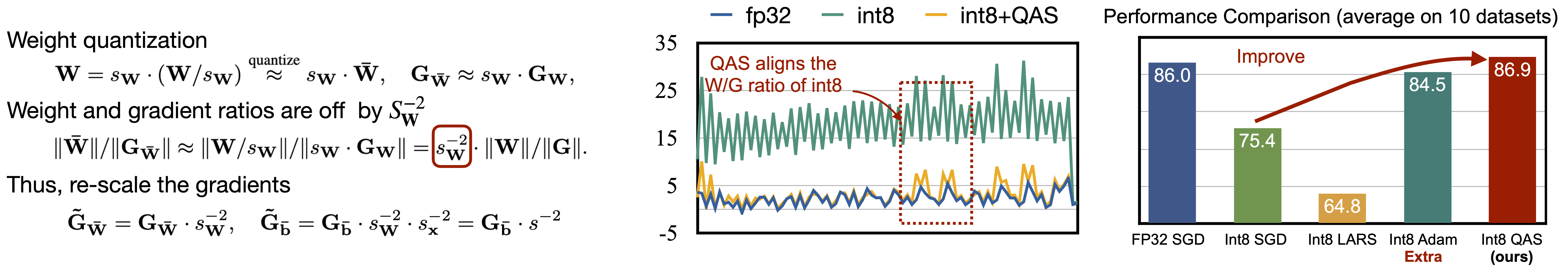 为了优化真实的量化图(见下文对比),我们提出了量化感知缩放(QAS)方法,用于自动调整梯度大小,从而有效稳定训练过程,并达到与FP32精度相当的效果。
