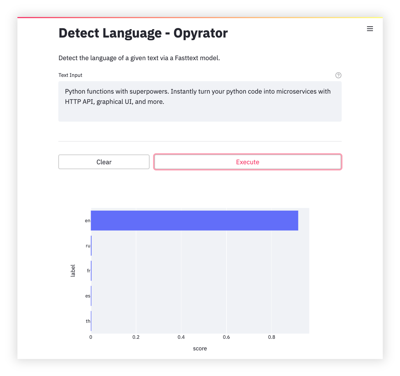将你的 Python 函数瞬间转变为生产就绪(production-ready)的微服务。通过 HTTP API 或交互式 UI 部署并访问你的服务。无缝导出服务为可移植、可共享、可执行的文件或 Docker 镜像。Opyrator 基于开放标准构建——OpenAPI、JSON Schema 和 Python 类型提示(type hints),并由 FastAPI、Streamlit 和 Pydantic 提供支持。它消除了将 Python 代码产品化和共享过程中的所有繁琐工作——只要你能将功能封装成一个 Python 函数即可。