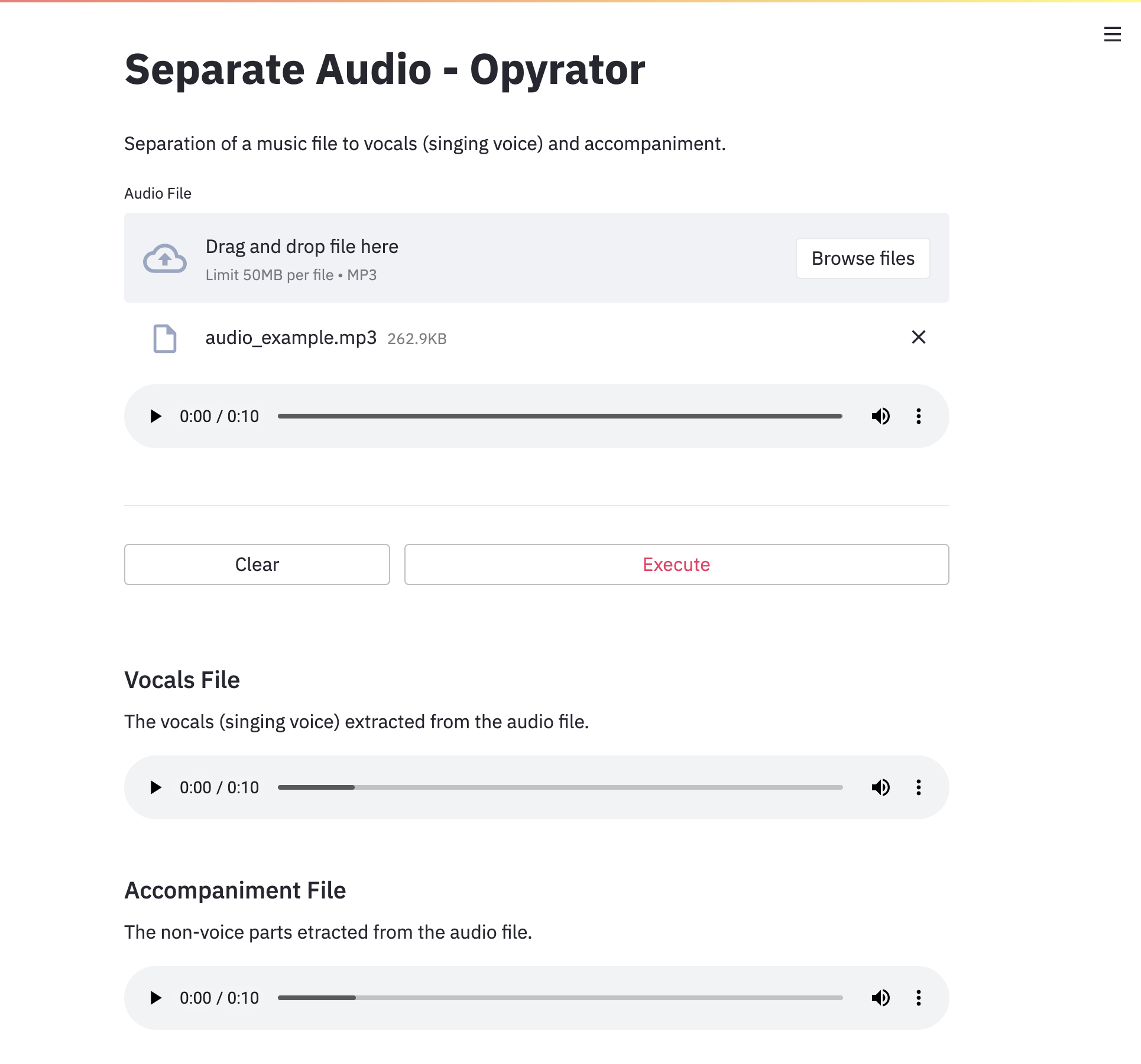 以下示例集合展示了 Opyrator 如何支持各种不同的任务和使用场景。所有这些示例都打包在一个演示 playground 中,你也可以通过 Docker 在自己的机器上部署: