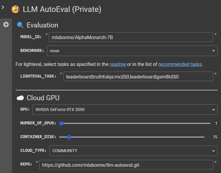 - 一键自动部署:只需在 Colab 中输入模型 ID 和基准名称,llm-autoeval 自动调用 RunPod 配置好所有环境与依赖,即刻开始测试。