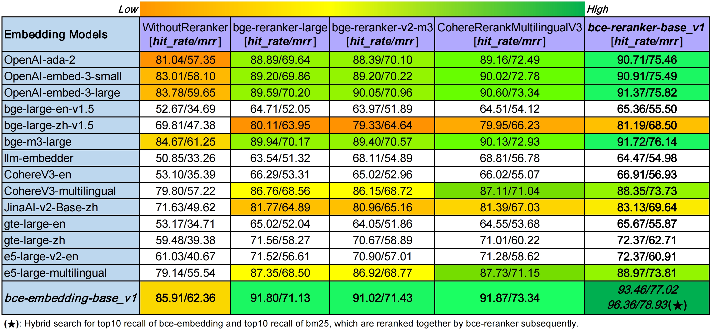 bce-reranker-base_v1达到了最佳性能。 bce-embedding-base_v1和bce-reranker-base_v1的组合达到了当前最优水平。- 如果您希望分别使用 embedding 和 rerank,请参考 BCEmbedding。