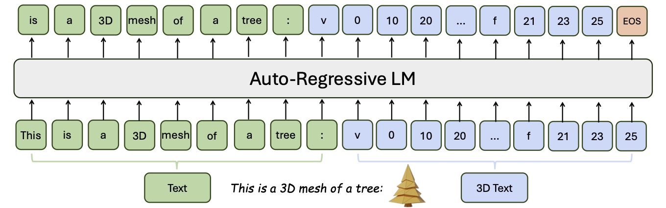 我们的方法概述。LLaMA-Mesh 通过将 3D 网格的顶点坐标和面定义的数值表示为纯文本,以统一的格式整合文本与 3D 网格。我们的模型采用端到端的方式,使用文本与 3D 交错的数据进行训练。因此,该模型可以在一个统一的框架内同时生成文本和 3D 网格。